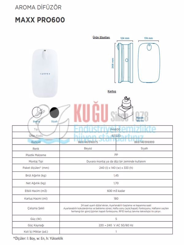 KGC-921220-B Carpex Siyah Renk Max Pro 600 m3 Alan Etkili Geniş Alan Kokulandırma Koku Makinesi (2 YIL GARANTİLİ)