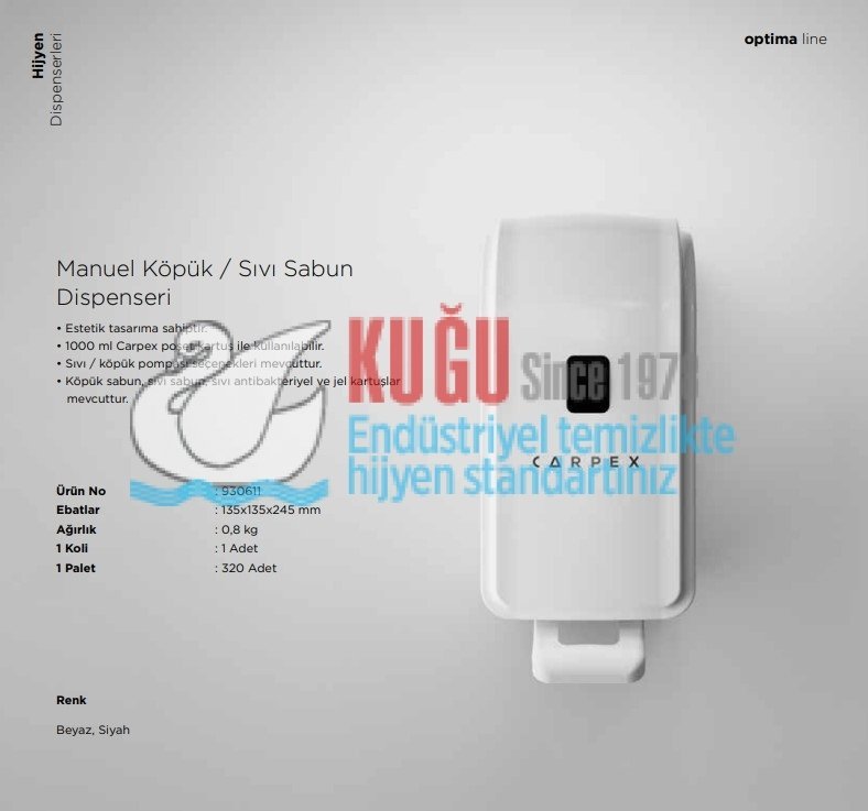 529306030001-W Carpex Beyaz Renk Optima 1000 ML Manuel Doldurabilinir Hazneli Köpük Sabun Dispenseri