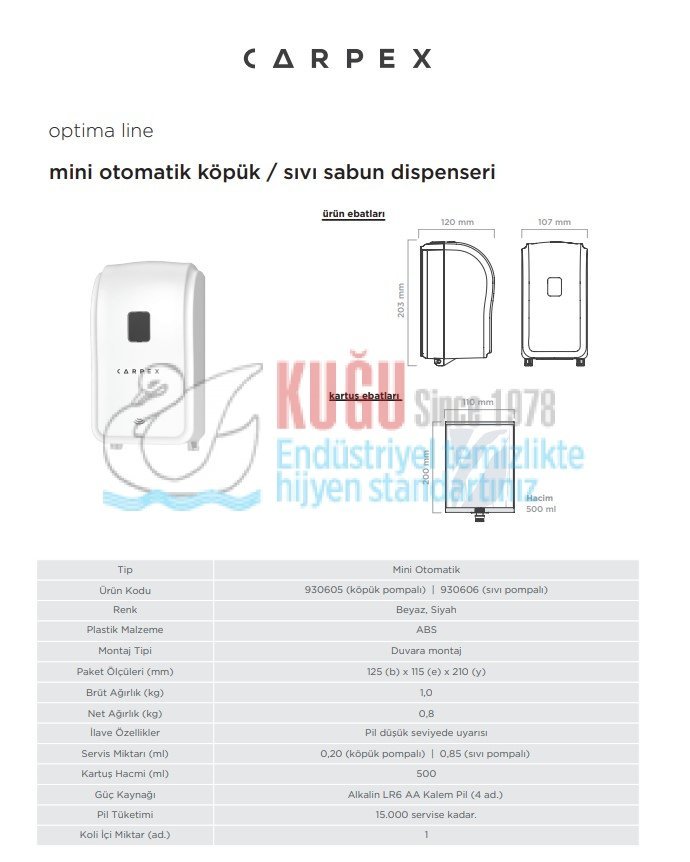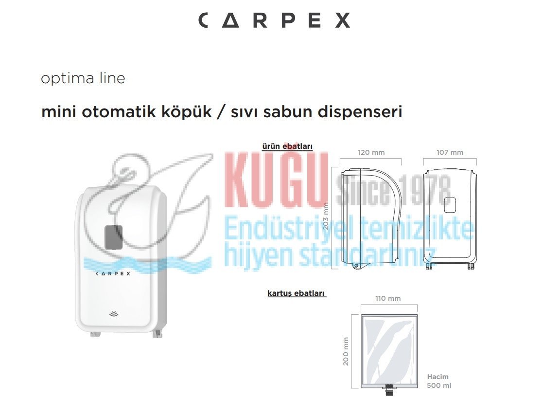 KGC-529306070001 Carpex Optima Beyaz Renk Sensörlü&Fotoseli Mini Üstten Doldurmalı 500 ML Köpük Sabun Dispenser Aparatı
