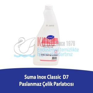 Diversey Suma Inox Classic D7, gıda ile temas etmemesi gereken paslanmaz çelik yüzeyler için kullanılmaktadır. Yüzeylere direkt uygulama şeklinde kullanılır. Buzdolabı, servis arabası, bulaşık yıkama makineleri ve soğutucu kapakları gibi gıda ile teması bulunmayan yüzeyler için geliştirilmiştir.