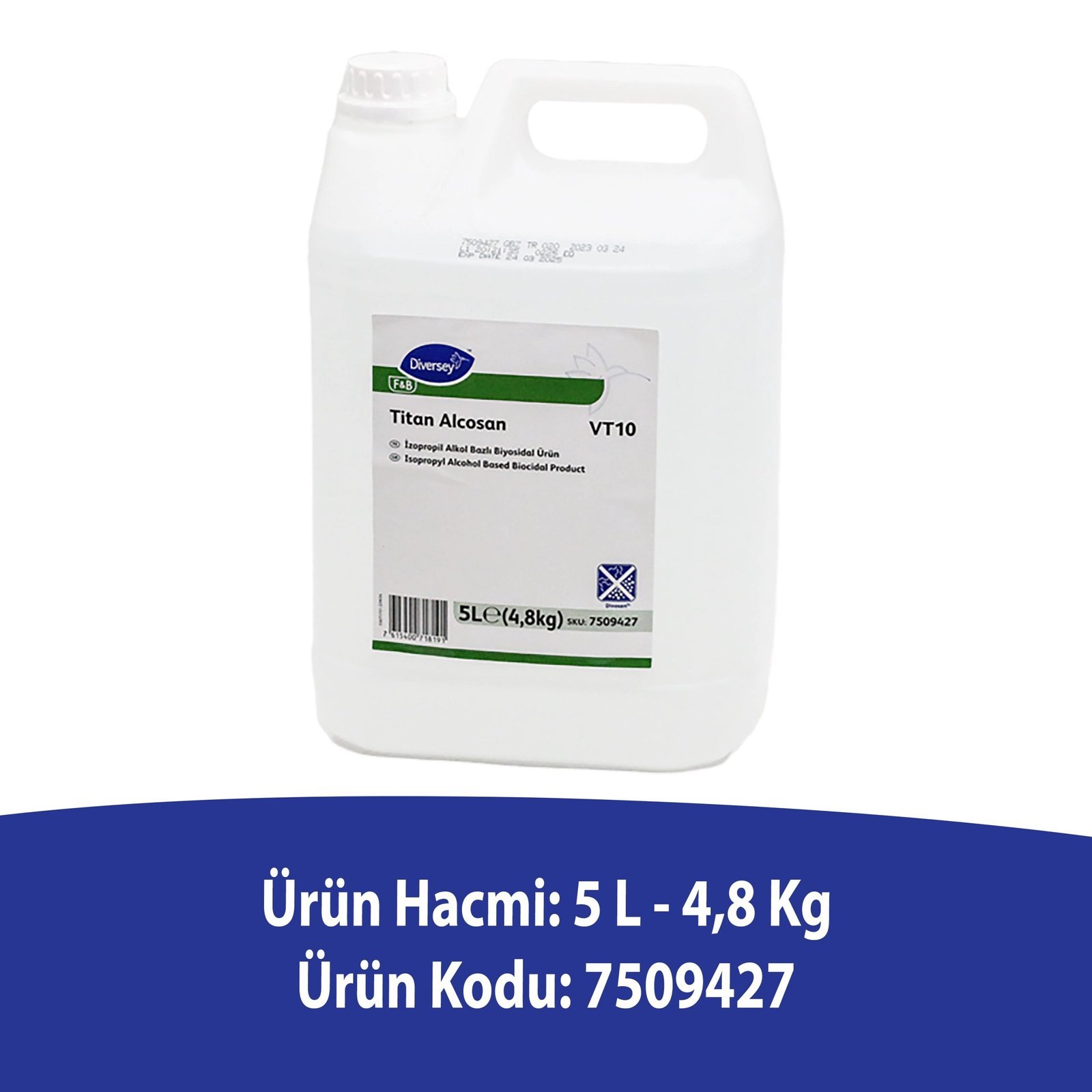 - Diversey Titan Alcosan VT10 5 L, güvenli bir şekilde kullanılabilir. Ürün, ekolojik çevre dostudur. Ayrıca, ürün kullanımı esnasında güvenli bir şekilde kullanılması için talimatlar verilir. Talimatları mutlaka okuyunuz. Herhangi bir tahriş gibi durumda doktorunuzu arayın.