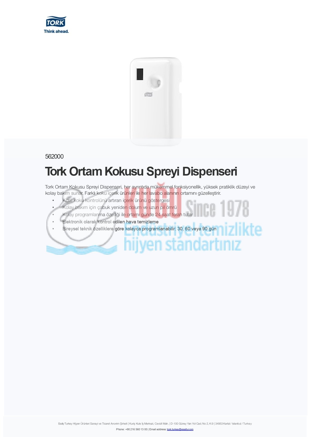 Tork Ortam Kokusu Spreyi Dispenseri, her ayrıntıda mükemmel fonksiyonellik, yüksek pratiklik düzeyi ve kolay bakım sunar. Farklı koku içerik ürünleri ile her lavabo alanının ortamını güzelleştirir.