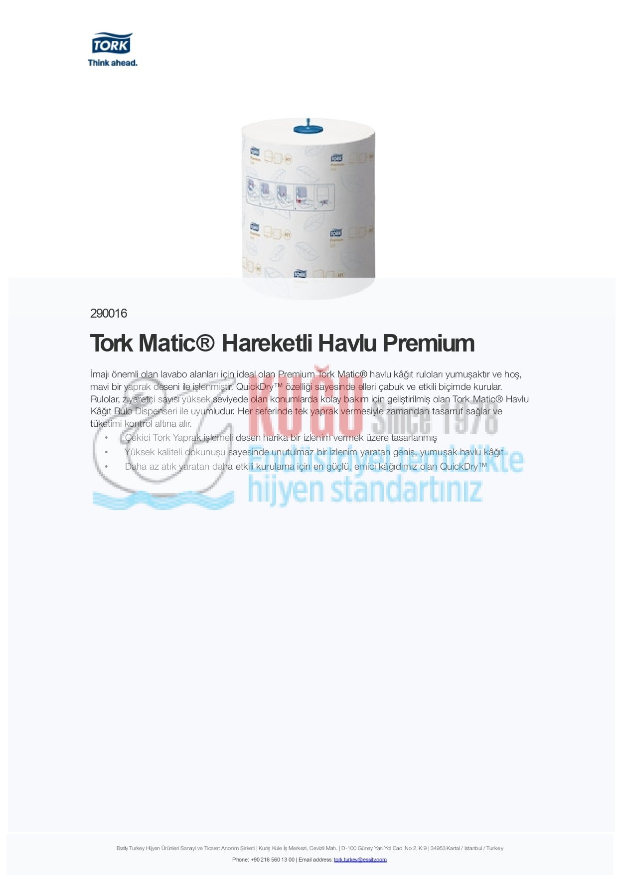 İmajı önemli olan lavabo alanları için ideal olan Premium Tork Matic® havlu kâğıt ruloları yumuşaktır ve hoş, mavi bir yaprak deseni ile işlenmiştir. QuickDry™ özelliği sayesinde elleri çabuk ve etkili biçimde kurular. Rulolar, ziyaretçi sayısı yüksek seviyede olan konumlarda kolay bakım için geliştirilmiş olan Tork Matic® Havlu Kâğıt Rulo Dispenseri ile uyumludur. Her seferinde tek yaprak vermesiyle zamandan tasarruf sağlar ve tüketimi kontrol altına alır.